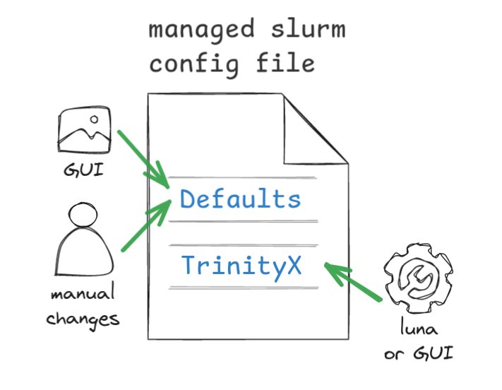 When using the Slurm Graphical configurator, it'll ask you to confirm using this approach from now on. This typically happens only once after which the managed blocks will be changed to show that the configuration is no longer managed by luna.
