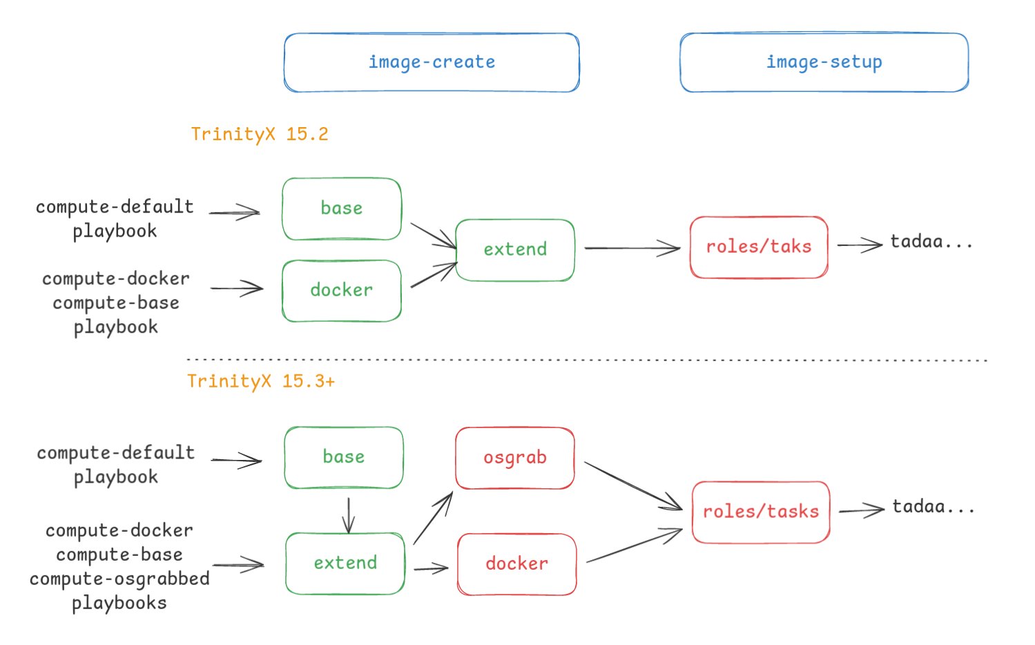 The main difference between TrinityX 15.2 and 15.3 is the way how packages are managed, utilizing OSgrab and Docker steps. These now typically run inside a chrooted environment, ensuring correct package installation (read: using the image local repositories). In the above diagram, parts that run inside a chrooted environment are red color highlighted.